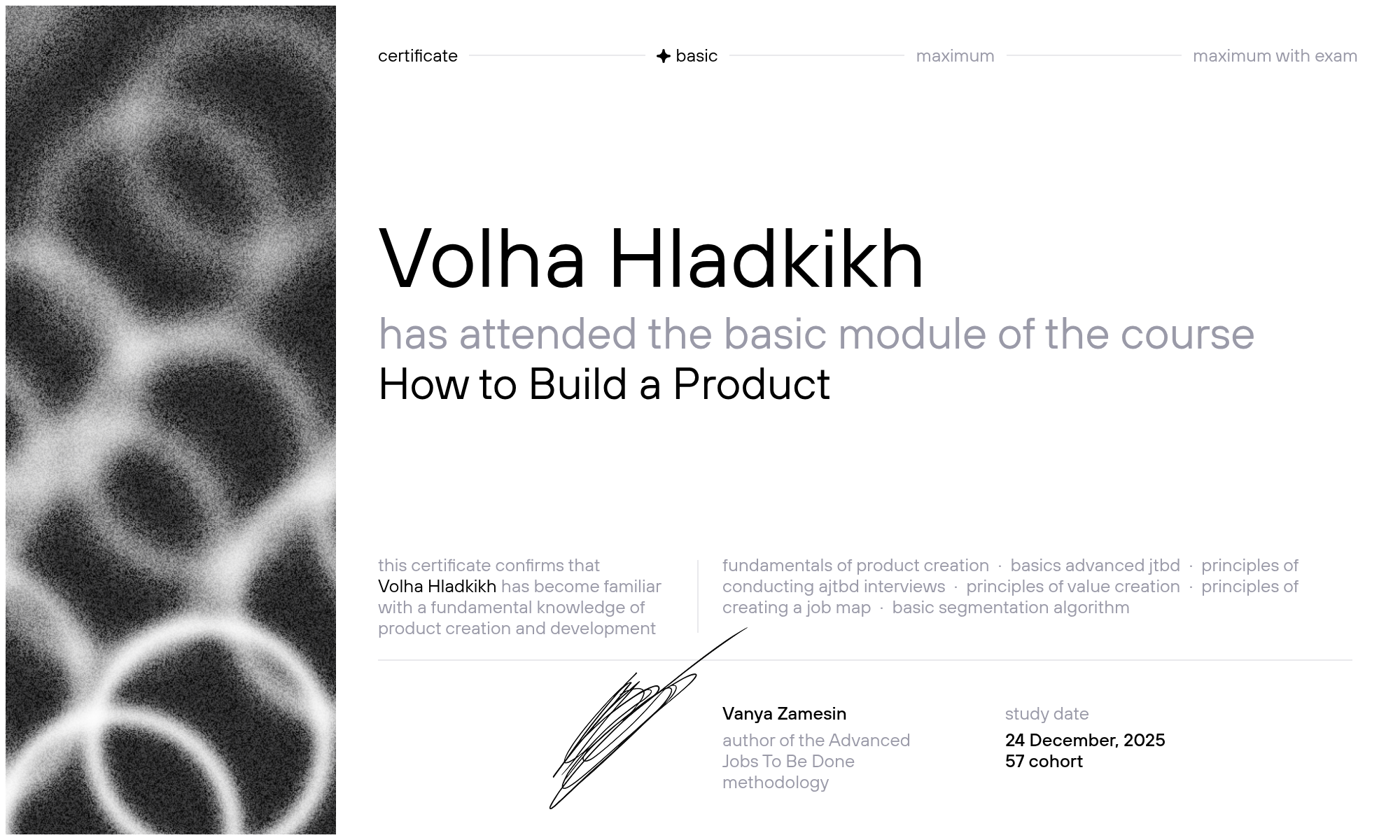this certificate confirms that Volha Hladkikh has become familiar with a fundamental knowledge of product creation and development