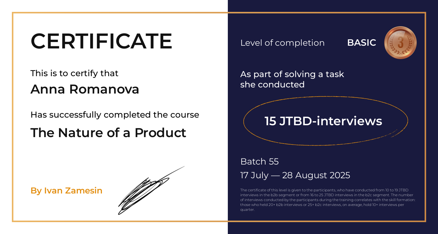 The certificate of this level is given to the participants, who have conducted from 10 to 19 JTBD interviews in the b2b segment or from 16 to 25 JTBD interviews in the b2c segment. The number of interviews conducted by the participants during the training correlates with the skill formation: those who held 20+ b2b interviews or 25+ b2c interviews, on average, hold 10+ interviews per quarter.