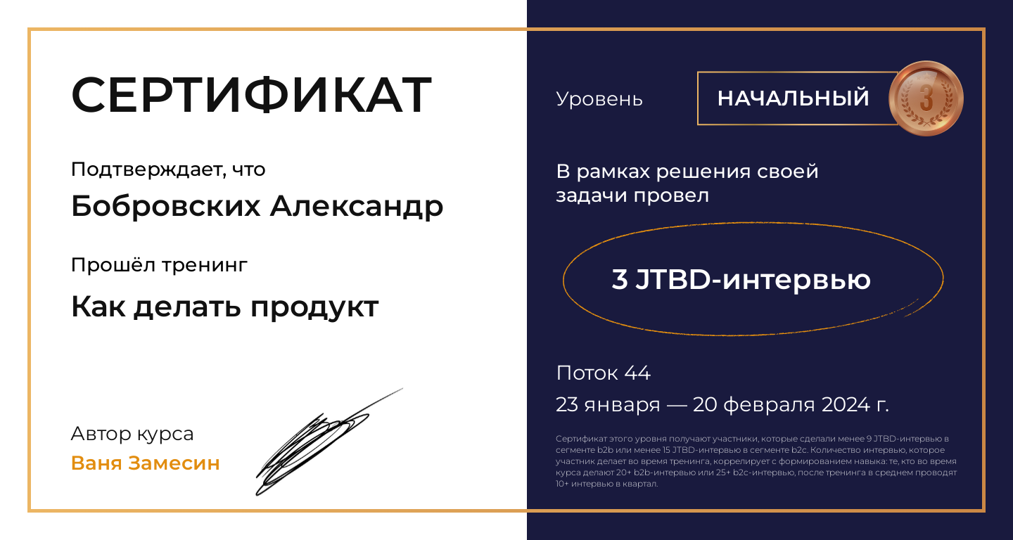 Сертификат этого уровня получают участники, которые сделали менее 9 JTBD-интервью в сегменте b2b или менее 15 JTBD-интервью в сегменте b2c. Количество интервью, которое участник делает во время тренинга, коррелирует с формированием навыка: те, кто во время курса делают 20+ b2b-интервью или 25+ b2c-интервью, после тренинга в среднем проводят 10+ интервью в квартал.