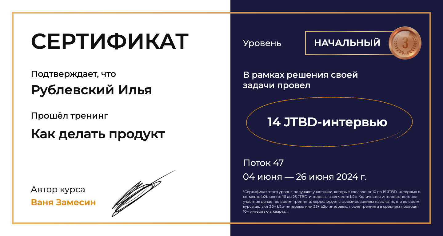 *Сертификат этого уровня получают участники, которые сделали от 10 до 19 JTBD-интервью в сегменте b2b или от 16 до 25 JTBD-интервью в сегменте b2с. Количество интервью, которое участник делает во время тренинга, коррелирует с формированием навыка: те, кто во время курса делают 20+ b2b-интервью или 25+ b2c-интервью, после тренинга в среднем проводят 10+ интервью в квартал.