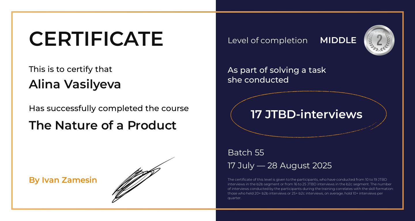 The certificate of this level is given to the participants, who have conducted from 10 to 19 JTBD interviews in the b2b segment or from 16 to 25 JTBD interviews in the b2c segment. The number of interviews conducted by the participants during the training correlates with the skill formation: those who held 20+ b2b interviews or 25+ b2c interviews, on average, hold 10+ interviews per quarter.