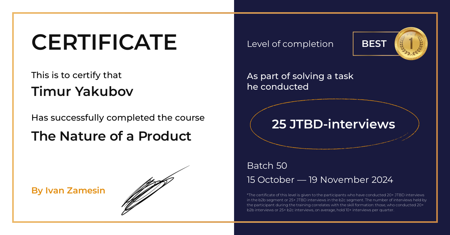 *The certificate of this level is given to the participants who have conducted 20+ JTBD interviews in the b2b segment or 25+ JTBD interviews in the b2c segment. The number of interviews held by the participant during the training correlates with the skill formation: those, who conducted 20+ b2b interviews or 25+ b2c interviews, on average, hold 10+ interviews per quarter.