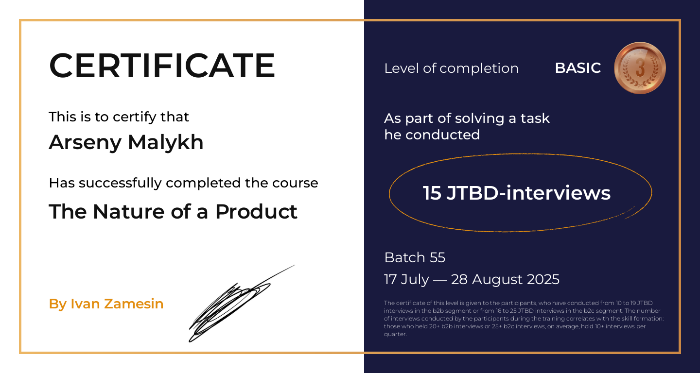 The certificate of this level is given to the participants, who have conducted from 10 to 19 JTBD interviews in the b2b segment or from 16 to 25 JTBD interviews in the b2c segment. The number of interviews conducted by the participants during the training correlates with the skill formation: those who held 20+ b2b interviews or 25+ b2c interviews, on average, hold 10+ interviews per quarter.