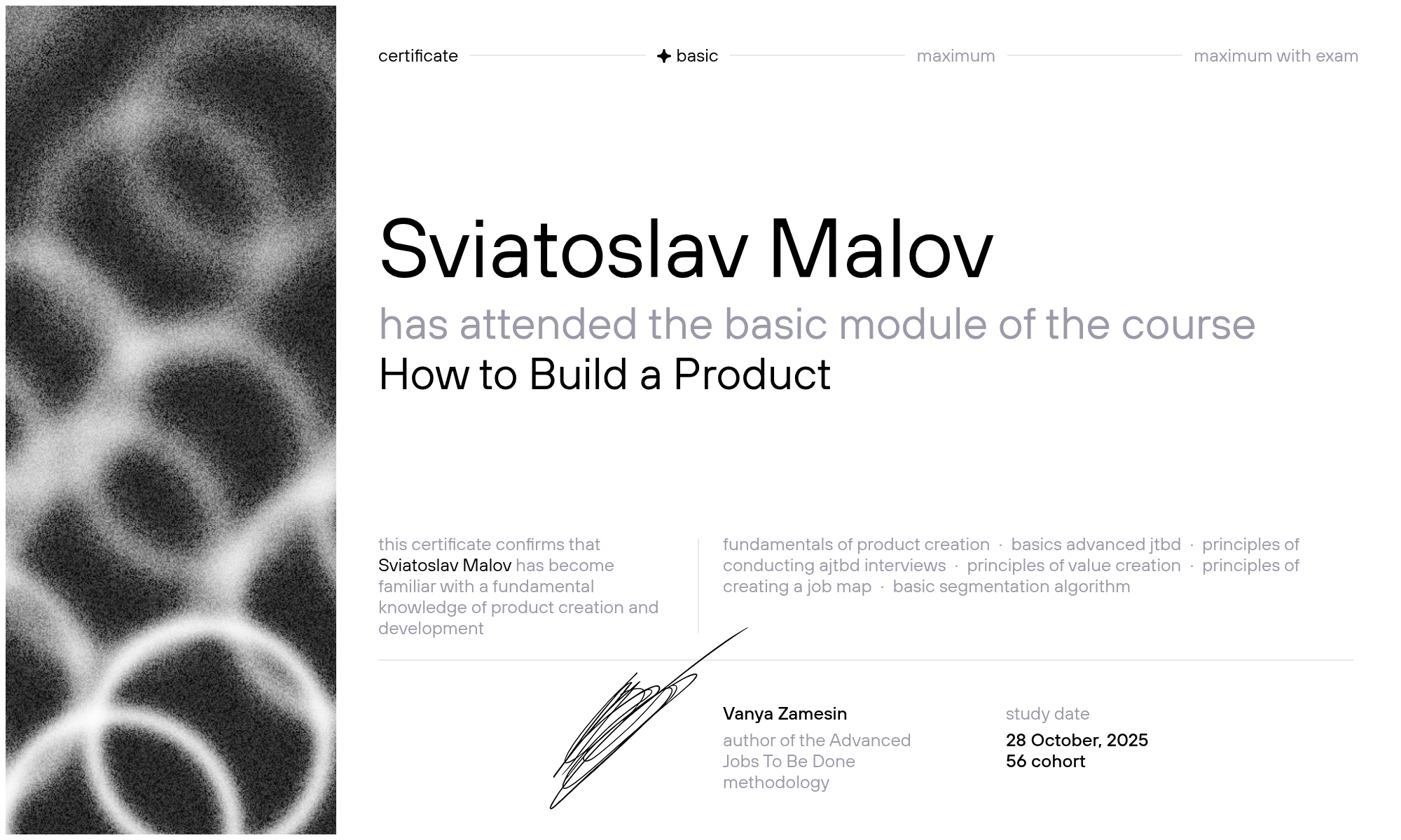 this certificate confirms that Sviatoslav Malov has become familiar with a fundamental knowledge of product creation and development