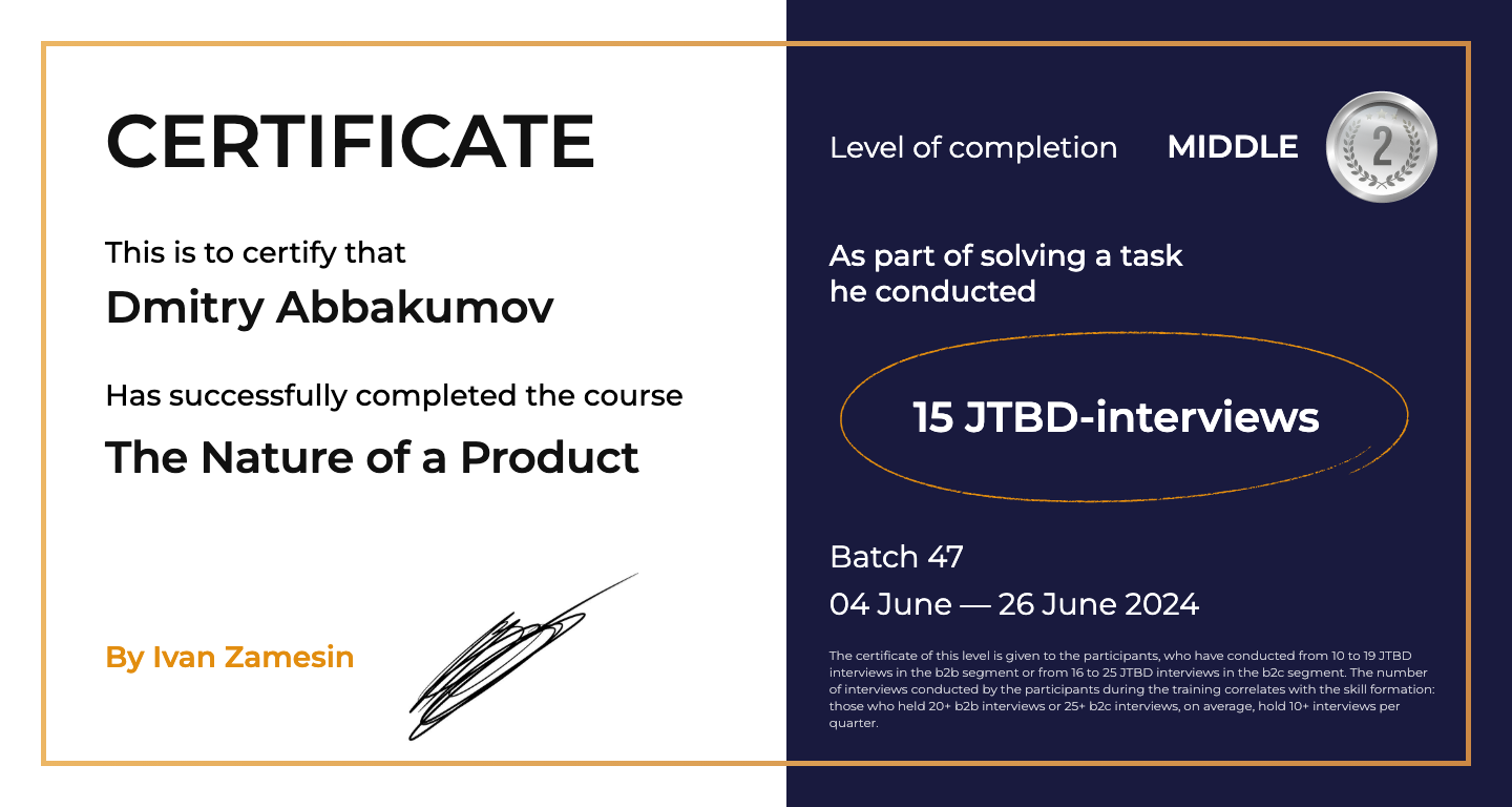 The certificate of this level is given to the participants, who have conducted from 10 to 19 JTBD interviews in the b2b segment or from 16 to 25 JTBD interviews in the b2c segment. The number of interviews conducted by the participants during the training correlates with the skill formation: those who held 20+ b2b interviews or 25+ b2c interviews, on average, hold 10+ interviews per quarter.